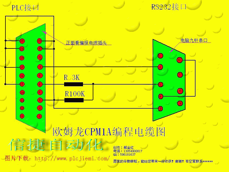 大家一起分享啊!細說一下:圖上畫的是編程電纜的plc 20針接頭的正面看,腳標注是我自己標的,不過omron公司沒有標注插腳號碼,其中100K的電阻也可以省略,這樣的話就相當簡單了,不會做不了吧?我做的電纜20針插頭都是我自己做的。材料原LG變頻器cpu板上的一個通訊插座,搞下來,剪去一半,只留20個腳,中間加一塊絕緣板隔開,封堵剛才切開的另一端,如圖焊接,自己做個外殼,就好了。只要有心一定會做的很好,我的很仿真奧!如果你有接頭的話就不用那么費事了,不過我是沒找到插頭啊,很難找!