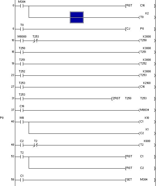 這是定時觸發故障程序,斷開m8034的線圈,這段程序的·功能將無效。具體運行多長時間可監控c16的當前值。運行時間=c16的當前值x20分鐘。