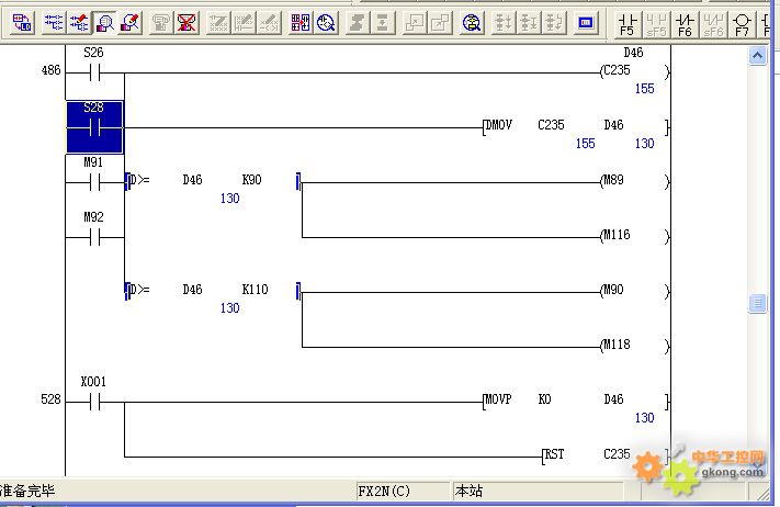 PLC是FX2N-128MR,20孔編碼盤套在馬達(dá)上,用接近開關(guān)進(jìn)X0,馬達(dá)轉(zhuǎn)動(dòng)同時(shí)驅(qū)動(dòng)高速計(jì)數(shù)器C235,得到的數(shù)據(jù)存進(jìn)D46,通過比較指令讓馬達(dá)停止,比較值有兩個(gè),一個(gè)是90,另一個(gè)是110,要求馬達(dá)在數(shù)值90和110時(shí)都停止,馬達(dá)停止時(shí)按下X1用RST和MOVP指令對(duì)C235和D46都?xì)w零。