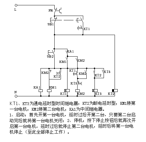 看圖SB1為啟動(dòng)按鈕,SB2為停止按鈕,KM1為第一臺(tái)電機(jī),KM2為第二臺(tái)電機(jī),KT3>KT2