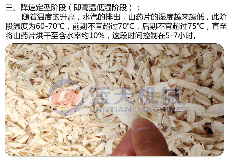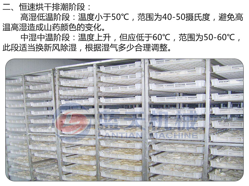 山藥的含水量大不宜長期儲存,所以為了山藥的長期保存,一般把山藥切片后用山藥烘干機進行烘干處理。山藥切片的厚薄、烘干溫度、烘干時間的把控對于山藥片的烘干效果很重要。小編給大家介紹下使用山藥烘干設備烘干上藥片的烘干過程。