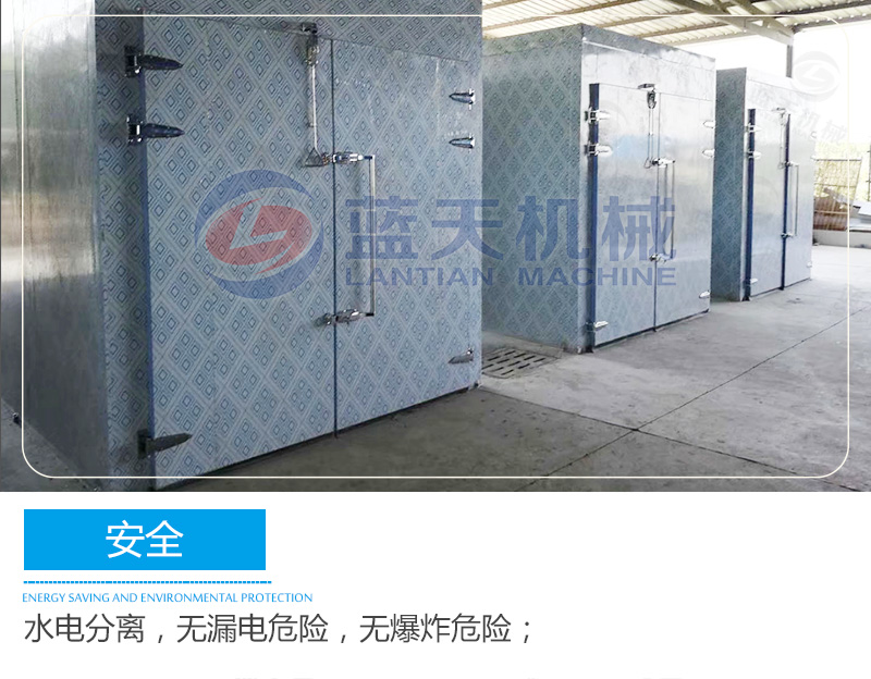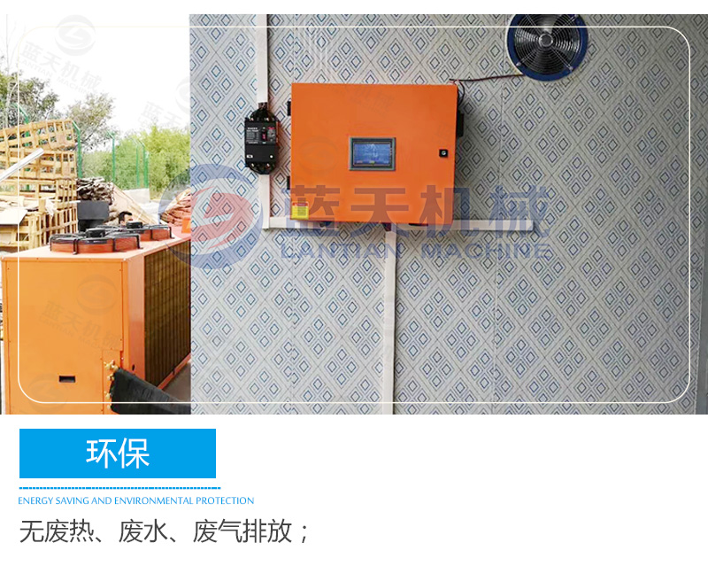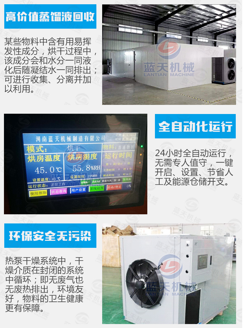 藍天海產品烘干機采用觸摸屏控制系統,可實現多個時段曲線控溫,操作簡單方便。海鮮烘干機吸收空氣的熱量并將其轉移到房內,實現烘干機內的溫度提高,配合相應的除濕裝置實現海產品的烘干干燥。海產品烘干機設備由壓縮機-換熱器(內機)-節流器-吸熱器(外機)-壓縮機等裝置構成一個循環系統(主機+烘干機)。冷媒在壓縮機的作用下在系統內循環流動。它在壓縮機內完成氣態的升壓升溫過程(溫度高達115℃),它進入內機釋放出高溫熱量加熱海產品烘干機內空氣,同時自己被冷卻并轉化為流液態,當它運行到外機后,液態迅速吸熱蒸發再次轉化為氣態,同時溫度下降至零下20℃-30℃,這時吸熱器周邊的空氣就會源源不斷地將熱量傳遞給冷媒。冷媒不斷地循環就實現將空氣中的熱量搬運到海鮮烘干機內加熱機內空氣溫度,從而實現能量的幾倍增長,消耗一度電產生的熱量相當于傳統電熱絲的4倍以上,達到效率高節能的效果。