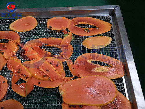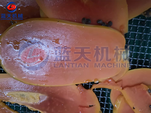 成熟的木瓜切片,厚度均勻的攤到物料盤上: